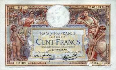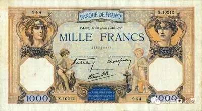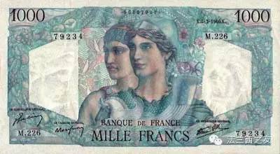 1945年1000法郎面值的纸币,纸币上的形象是智慧女神雅典娜和大力神赫丘利