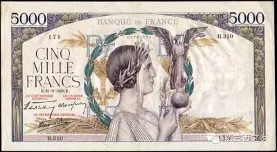 1949年5000法郎面值的纸币,纸币上的形象是寓意土地和大海女神。