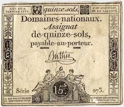 法国大革命时期的指券,面值15个苏