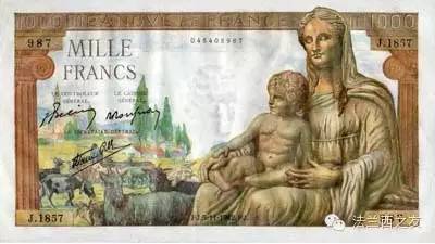 1942年1000法郎面值的纸币,纸币上的形象是希腊神话中的地母神得墨忒耳。