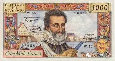 1957年5000旧法郎面值的纸币,纸币上印的是亨利四世的头像