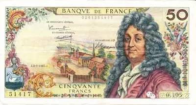 1962年50法郎面值的纸币,纸币上印的是剧作家拉辛的头像。