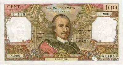 1964年,100法郎面值的纸币,纸币上印的是悲剧家高乃依的头像